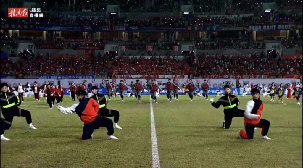 服装与道具设计同样别具用心,红黑配色服饰彰显青春活力,定制花球印刻“赣超加油”字样,既紧扣“地域特色”与“团队精神”双重主题,又全方位提升了视觉表现力,使得节目编排更具深意。