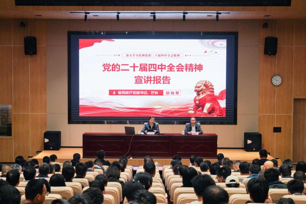 本网讯 根据省委统一安排,11月12日下午,学习贯彻党的二十届四中全会精神省委宣讲团报告会在我校三江校区(东园)启航会议中心2号会议厅举行。省委宣讲团成员、省民政厅党组书记、厅长邱向军作专题宣讲报告,进一步推动学习贯彻全会精神在我校走深走实。校党委书记刘祖文主持报告会。