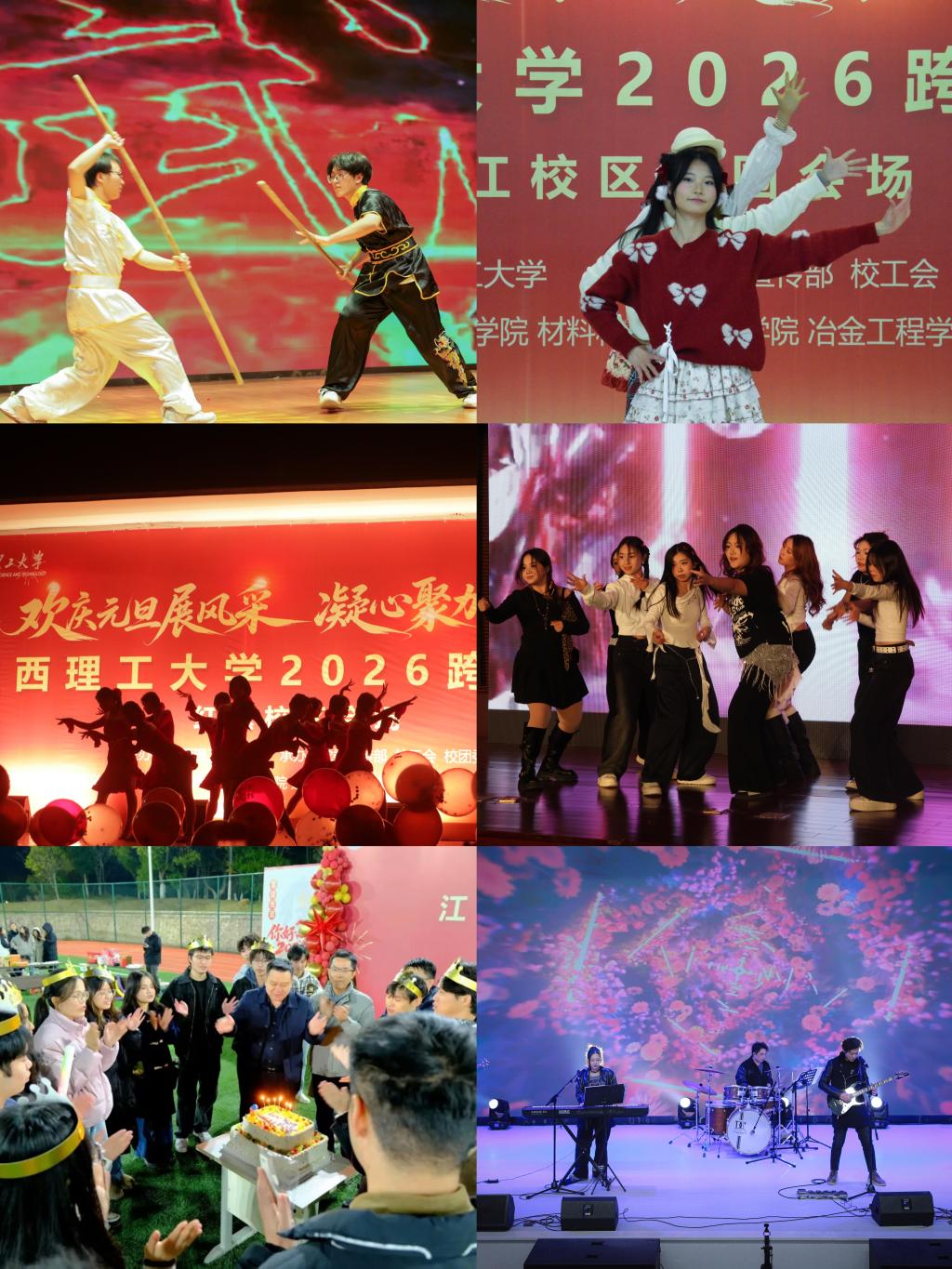 三江校区、红旗校区、南昌校区及各产业学院为广大师生献上乐队演出、互动游戏、文艺快闪等多元形式节目展演。歌唱表演中学子们以热情激昂的歌声唱响青春主旋律,引发全场强烈共鸣;社团风采展演百花齐放,活力舞蹈点燃现场氛围,师生们在欢声笑语中告别旧岁、喜迎新年,共同镌刻下跨年夜的温暖记忆。