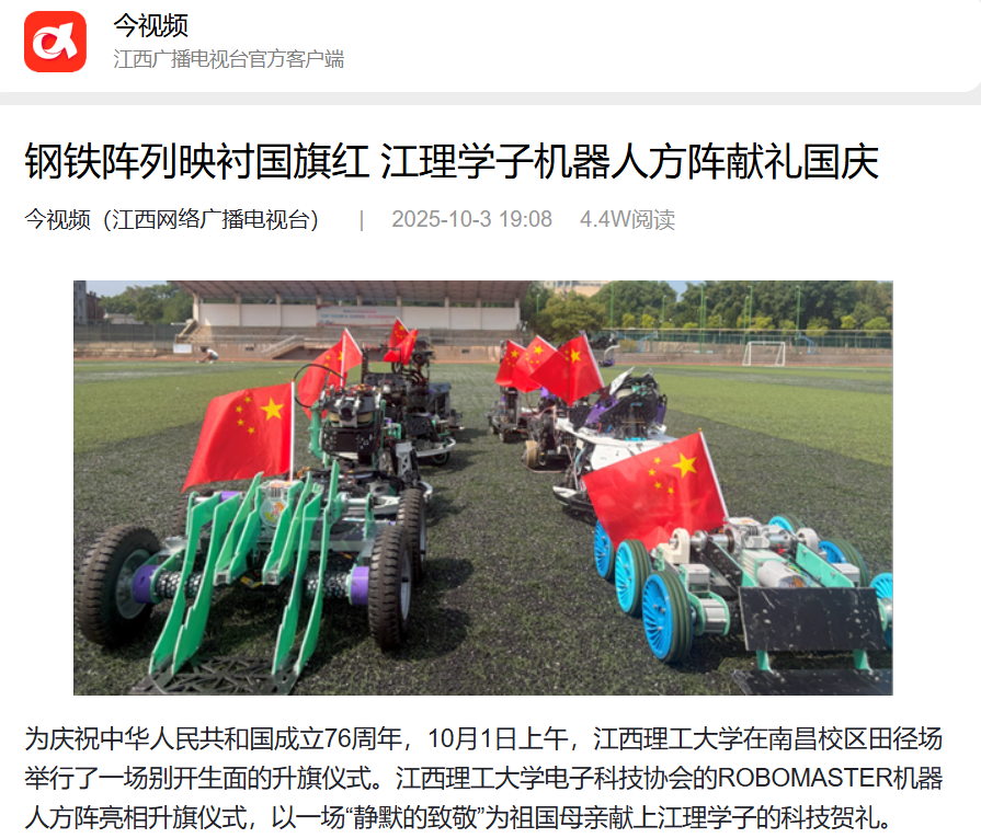 “虽然此次机器人没有动态表演,但让它们与我们一起参加此次升旗仪式,本身就是一种致敬。”江西理工大学电子科技协会成员、2023级学生廖涛表示,“这些机器人是我们亲手完成编程和调试的,它们承载着我们的汗水和对未来的憧憬。在这个特殊的日子,让它们一同见证国旗升起,就是想告诉所有人,在建设科技强国的道路上,我们青年科技爱好者将继续书写精彩的青春篇章!”(文/熊飞龙、罗雨馨 图/熊飞龙)