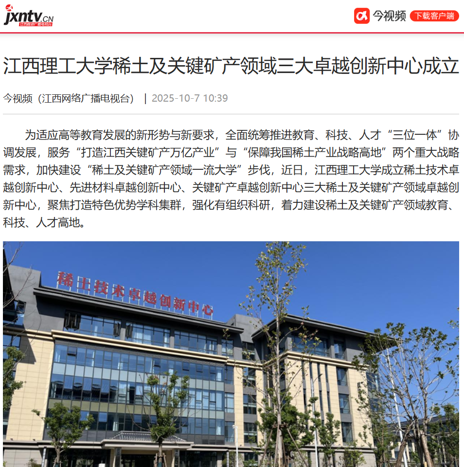 《江西网络广播电视台》:江西理工大学稀土及关键矿产领域三大卓越创新中心成立