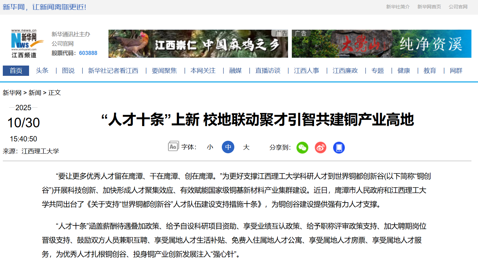 《新华网》:“人才十条”上新 校地联动聚才引智共建铜产业高地