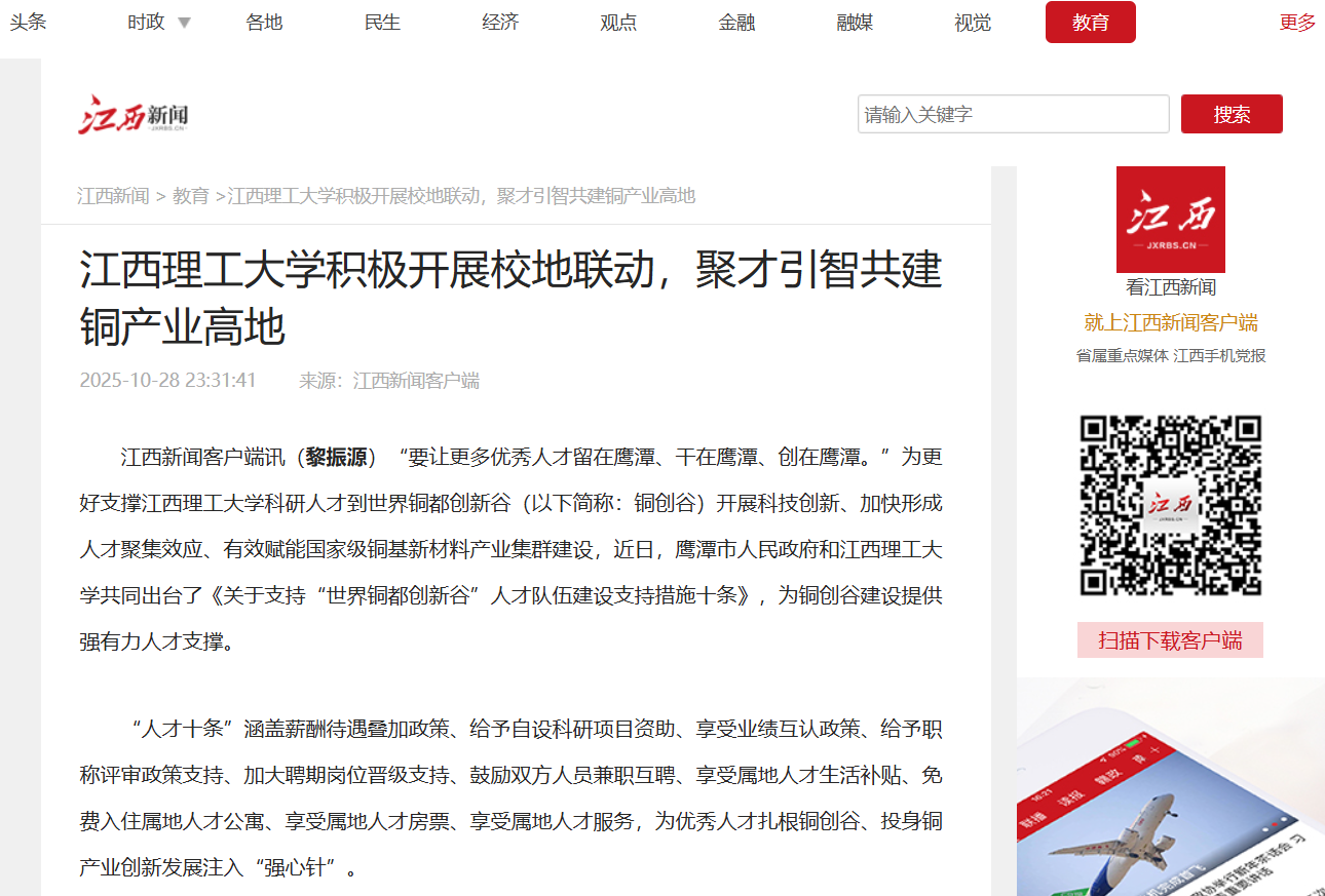 《江西新闻》:江西理工大学积极开展校地联动,聚才引智共建铜产业高地