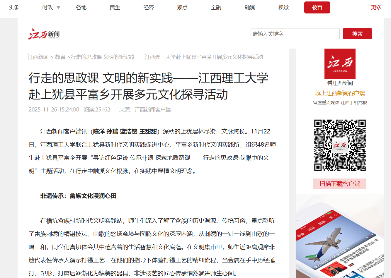 此次活动以行走的思政课为载体,实现了红色文化、非遗与地质生态文化的有机融合,既让师生在实践中拓宽了视野、厚植了情怀,也为校地文明实践双向赋能、助力乡村振兴搭建了坚实桥梁。江西理工大学将持续推动高校优质资源与地方发展需求精准对接,以更多元的形式传承文明根脉、服务地方发展。