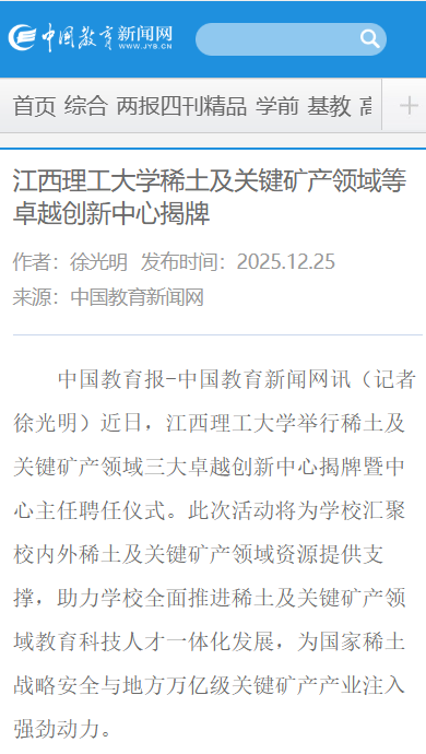 《中国教育新闻网》:江西理工大学稀土及关键矿产领域等卓越创新中心揭牌