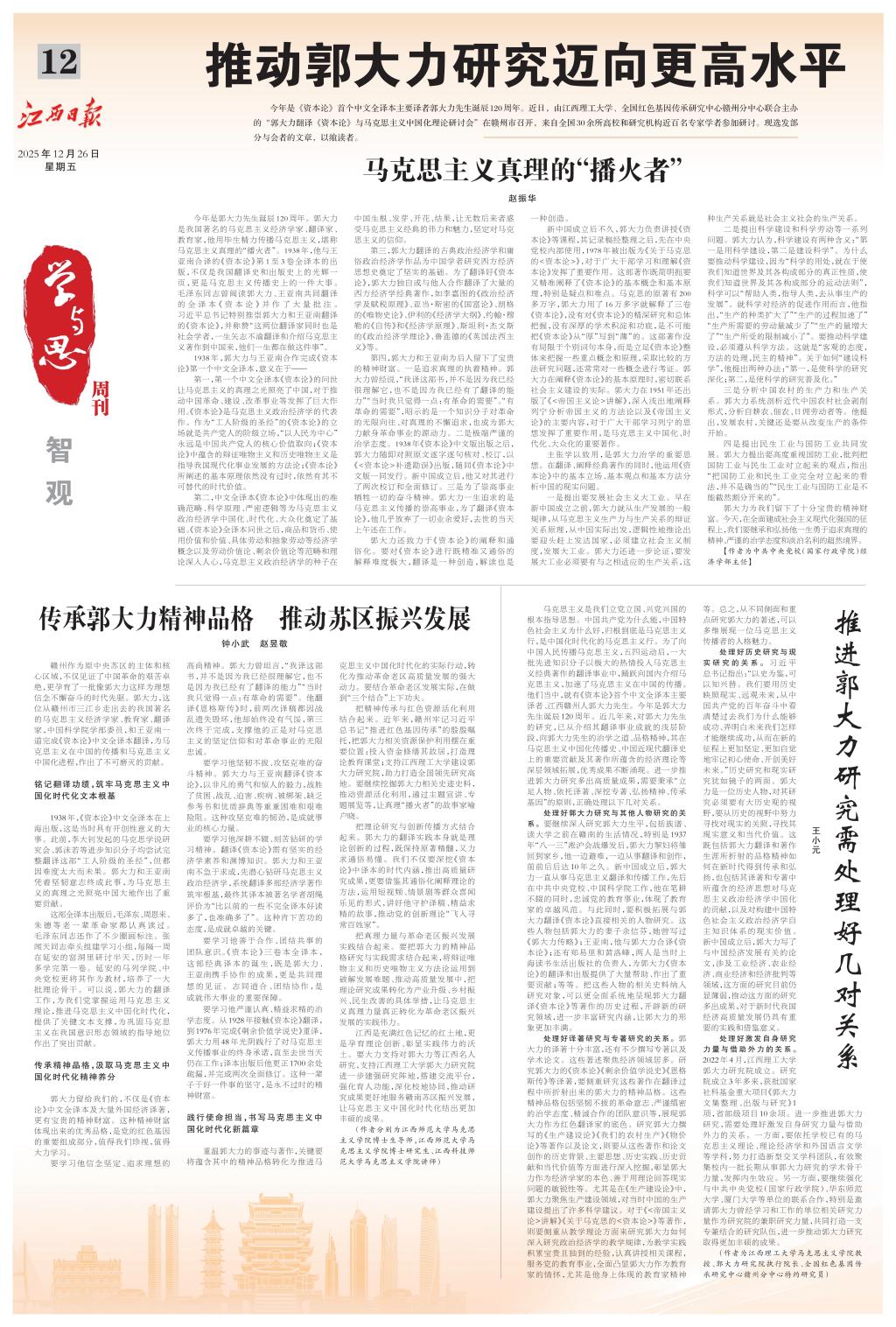 马克思主义是我们立党立国、兴党兴国的根本指导思想。中国共产党为什么能,中国特色社会主义为什么好,归根到底是马克思主义行,是中国化时代化的马克思主义行。为了向中国人民传播马克思主义,五四运动后,一大批先进知识分子以极大的热情投入马克思主义经典著作的翻译事业中,踊跃向国内介绍马克思主义,加速了马克思主义在中国的传播。他们当中,就有《资本论》首个中文全译本主要译者、江西赣州人郭大力先生。今年是郭大力先生诞辰120周年。近几年来,对郭大力先生的研究,已从介绍其翻译事业成就的浅层阶段,向郭大力先生的治学之道、品格精神,其在马克思主义中国化传播史、中国近现代翻译史上的重要贡献及其著作所蕴含的经济理论等深层领域拓展,优秀成果不断涌现。进一步推进郭大力研究多出高质量成果,需要秉承“立足人物、依托译著、深挖专著、弘扬精神、传承基因”的原则,正确处理以下几对关系。