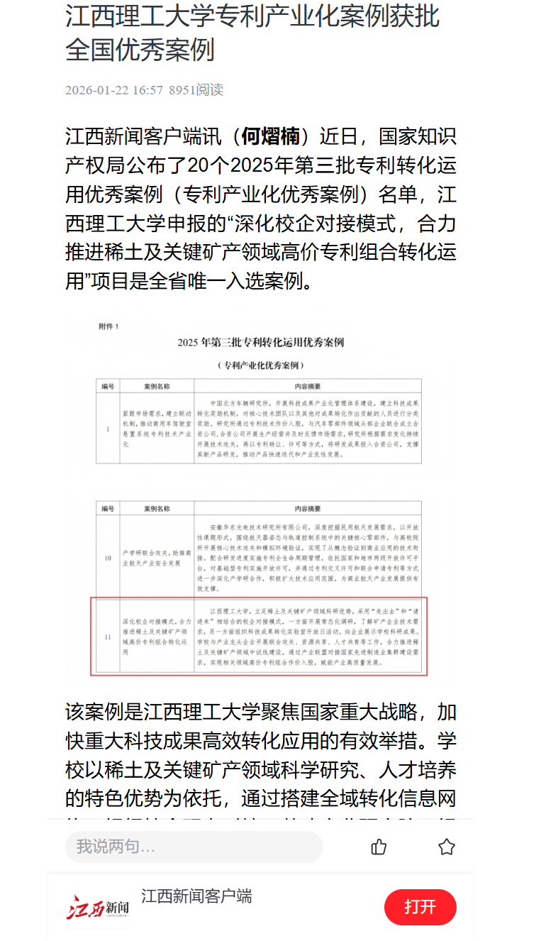 江西新闻客户端讯(何熠楠)近日,国家知识产权局公布了20个2025年第三批专利转化运用优秀案例(专利产业化优秀案例)名单,江西理工大学申报的“深化校企对接模式,合力推进稀土及关键矿产领域高价专利组合转化运用”项目是全省唯一入选案例。