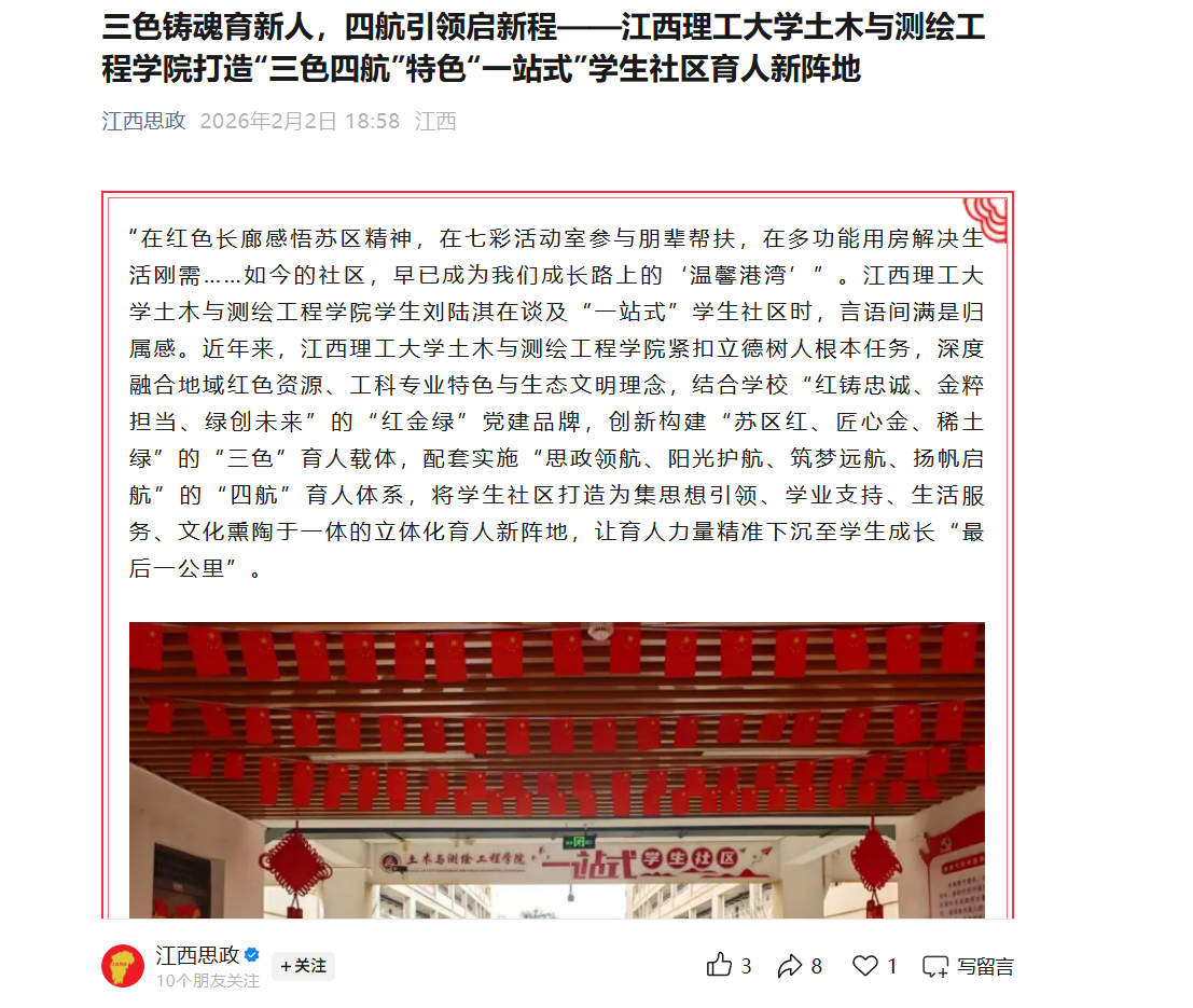 “我们始终致力于将‘三色四航’理念融入社区建设每一处细节,让社区成为思想的加油站、学业的护航舰、生活的温馨港、成长的练兵场”。江西理工大学土木与测绘工程学院党委书记贾群燕表示,下一步,学院将持续深化“一站式”学生社区建设,不断优化育人载体、创新服务模式,推动育人资源再集聚、育人效能再提升,引导青年学子在红金绿三色浸润中坚定理想信念、锤炼过硬本领,在四航引领下勇担时代使命、逐梦远航。