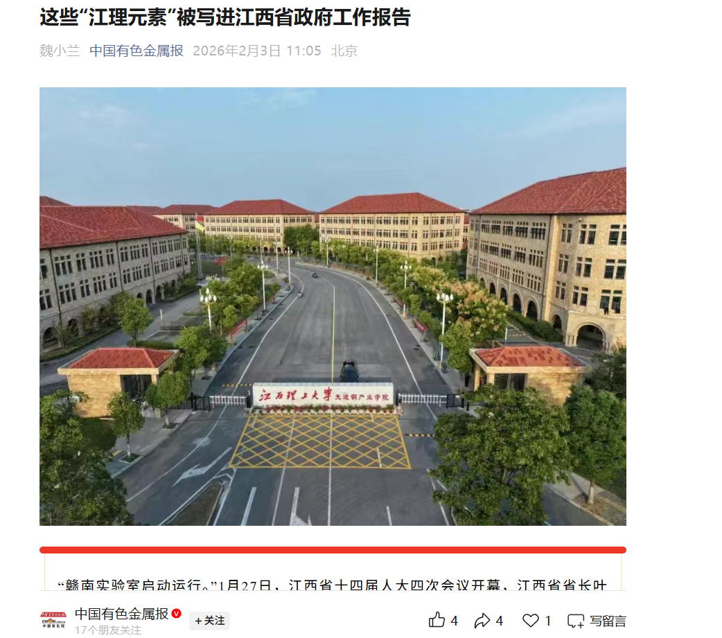 在回顾2025年工作时,该报告1次提到“江理元素”,明确点出“赣南实验室启动运行”。此前,赣南实验室启动会在江西理工大学举行,该实验室是以江西理工大学为依托建设的省级新型研发平台,叶建春出席启动仪式并为实验室揭牌。