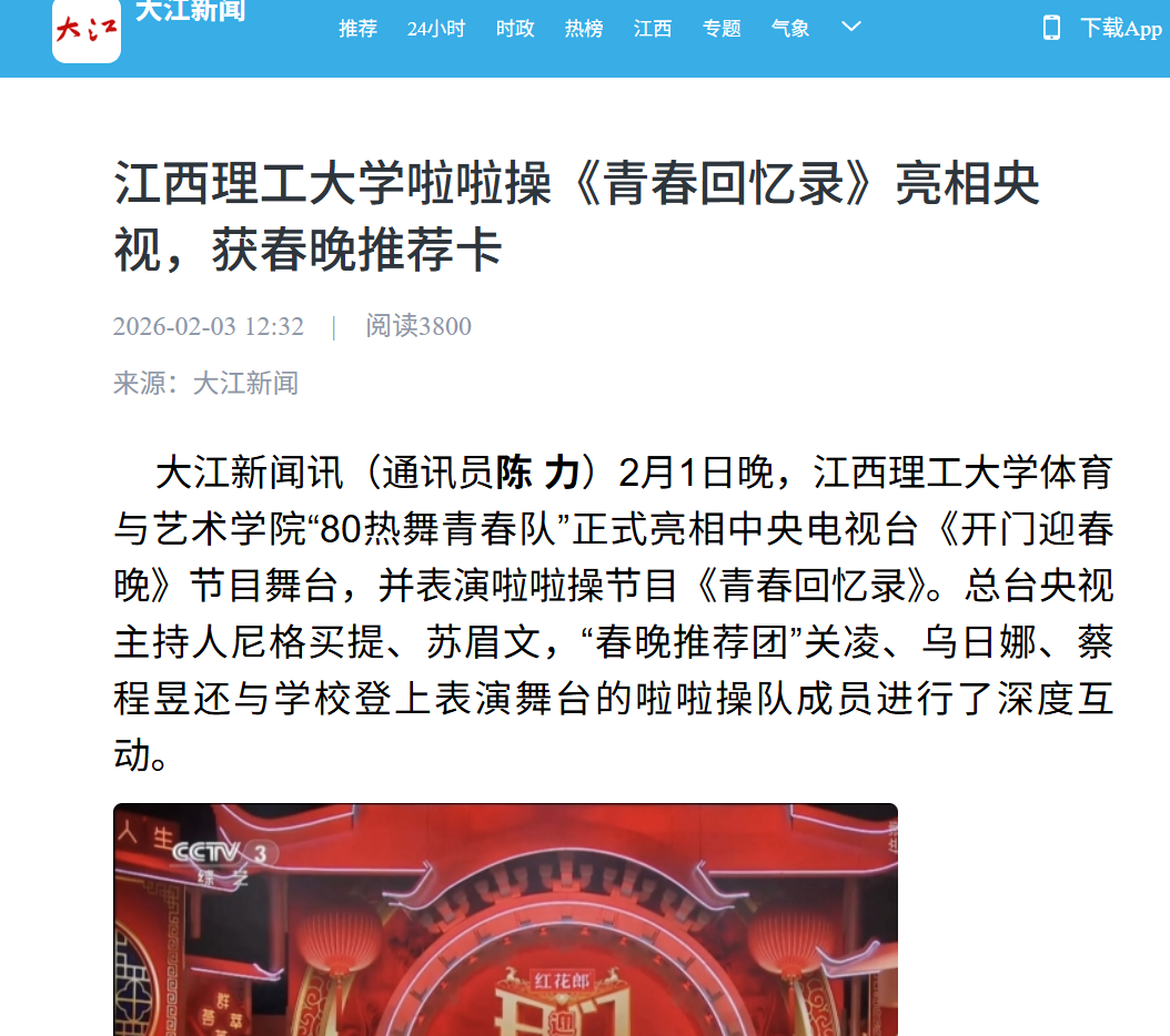 《大江新闻》:江西理工大学啦啦操《青春回忆录》亮相央视,获春晚推荐卡