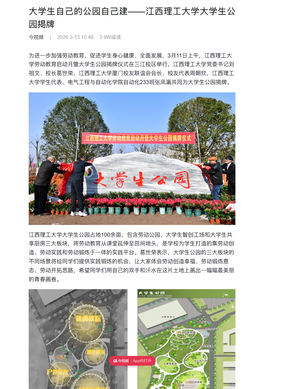为进一步加强劳动教育,促进学生身心健康、全面发展,3月11日上午,江西理工大学劳动教育启动月暨大学生公园揭牌仪式在三江校区举行,江西理工大学党委书记刘祖文、校长葛世荣,江西理工大学厦门校友联谊会会长、校友代表周朝炊,江西理工大学学生代表、电气工程与自动化学院自动化233班张凤瀛共同为大学生公园揭牌。