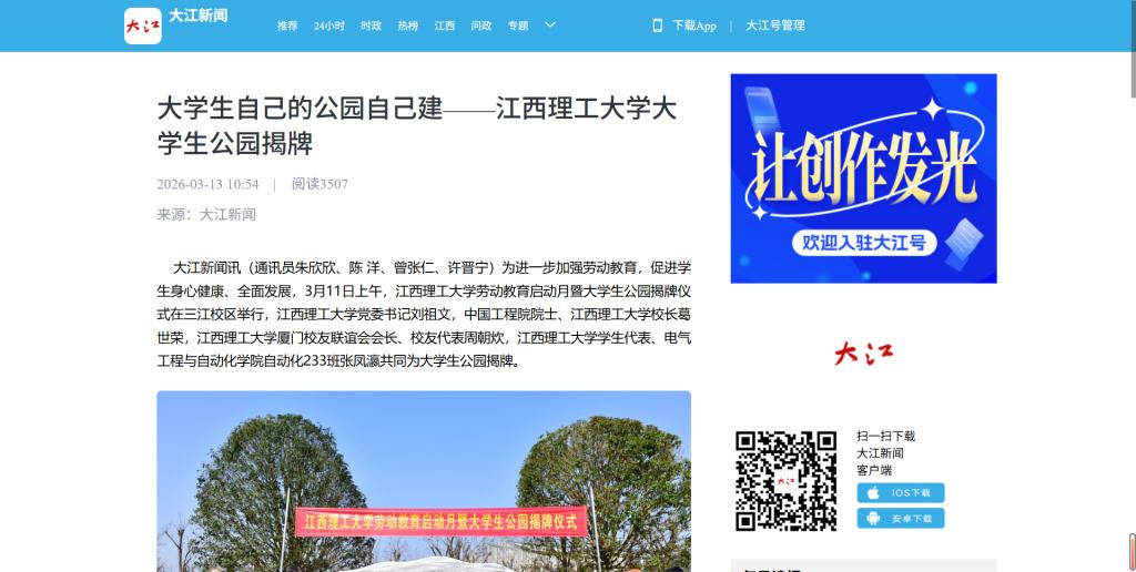 江西理工大学自动化223班程坤同学说道,“今天了解了大学生公园的规划,感受到学校很用心地为我们打造了一片放松身心、亲近自然的空间。今天亲手种下树苗,也让我更加真切地体会到大学生公园是我们共同参与、共同建设的成果。未来,我相信大学生公园不仅会成为校园的生态景观,更是我们学习生活之余的休闲空间、实践基地和文化阵地,我很期待由大家建造的大学生公园会是什么模样。”