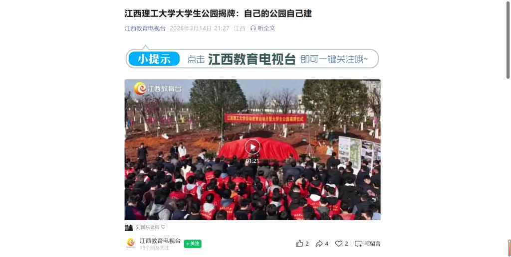 上一条:《江西思政》:大学生自己的公园自己建——江西理工大学大学生公园揭牌 下一条:《大江新闻》:大学生自己的公园自己建——江西理工大学大学生公园揭牌