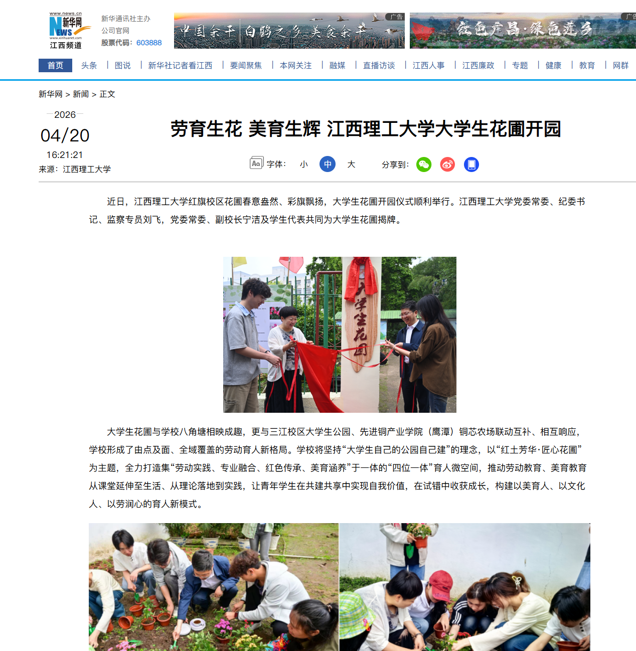 大学生花圃与学校八角塘相映成趣,更与三江校区大学生公园、先进铜产业学院(鹰潭)铜芯农场联动互补、相互响应,学校形成了由点及面、全域覆盖的劳动育人新格局。学校将坚持“大学生自己的公园自己建”的理念,以“红土芳华·匠心花圃”为主题,全力打造集“劳动实践、专业融合、红色传承、美育涵养”于一体的“四位一体”育人微空间,推动劳动教育、美育教育从课堂延伸至生活、从理论落地到实践,让青年学生在共建共享中实现自我价值,在试错中收获成长,构建以美育人、以文化人、以劳润心的育人新模式。