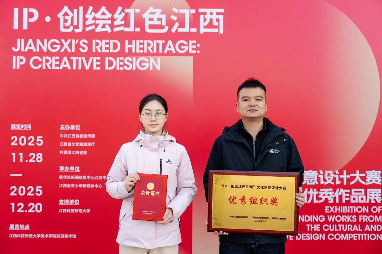 本网讯 近日,江西省“IP·创绘红色江西”文化创意设计大赛颁奖仪式暨展览在江西科技师范大学隆重举行。我校建筑与设计学院学子在此次赛事中表现突出,斩获多项荣誉。其中,郭文瞻、董翔老师指导的学生吴丽君同学创作的作品,分别荣获二等奖、三等奖各一项;郭文瞻、董翔两位指导老师凭借出色的教学指导能力,获评“优秀指导老师”;我校因组织有力、参赛成果丰硕,被授予“优秀组织单位”称号。