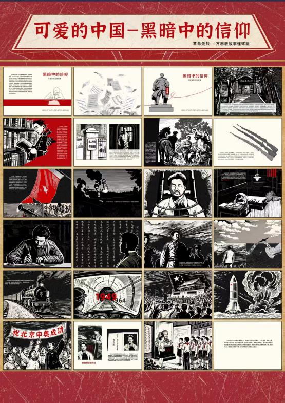 据悉,获奖作品《黑暗中的信仰》以无产阶级革命家方志敏烈士的人生轨迹为核心叙事线索,通过细腻的画面和生动的笔触,全景式再现了方志敏从少年求学立志、毅然投身革命洪流,到身陷囹圄仍坚守信仰、挥笔书写家国情怀的壮阔一生。作品在创作手法上独具匠心,尤其在结尾处设计了一组跨越时空的视觉对比:前一页完整呈现方志敏烈士在狱中写下的“可爱的中国”经典文字愿景,后一页则以写实风格描绘出当代中国高铁飞驰、高楼林立、人民笑容绽放的繁华图景,直观而有力地展现出烈士当年的理想已然成为美好现实,引发观者强烈的情感共鸣。