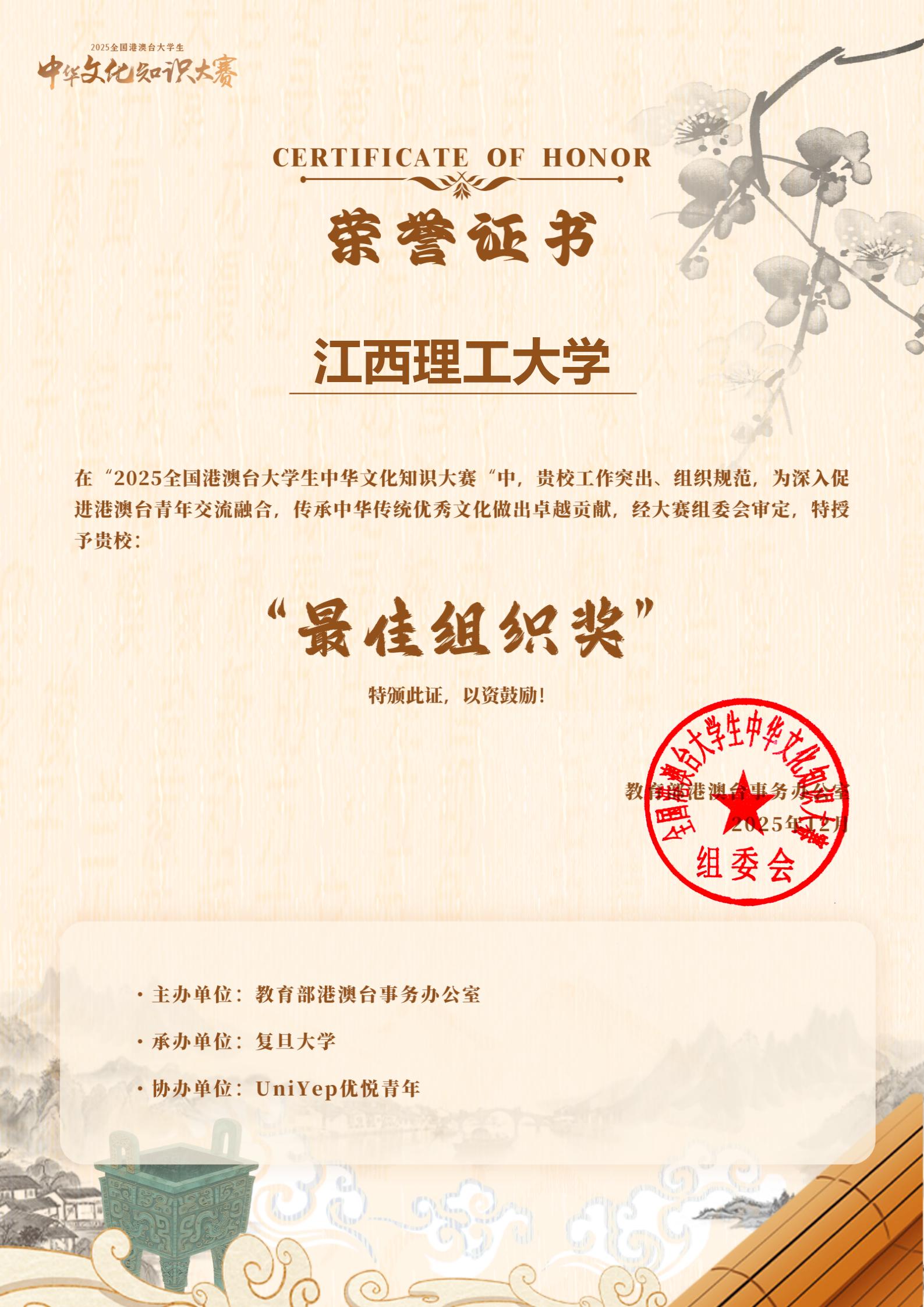 本网讯 近日,由教育部港澳台事务办公室主办、复旦大学承办的2025年内地(大陆)高校港澳台学生中华文化知识大赛顺利落幕。我校在本届大赛中表现优异,荣获“最佳组织奖”。外国语学院江宇豪老师获评“优秀指导老师”,所有参加全国复赛的学生均获得参赛证书。充分体现了学校在推动港澳台学生文化交流、促进中华文化传承方面取得的扎实成效。
